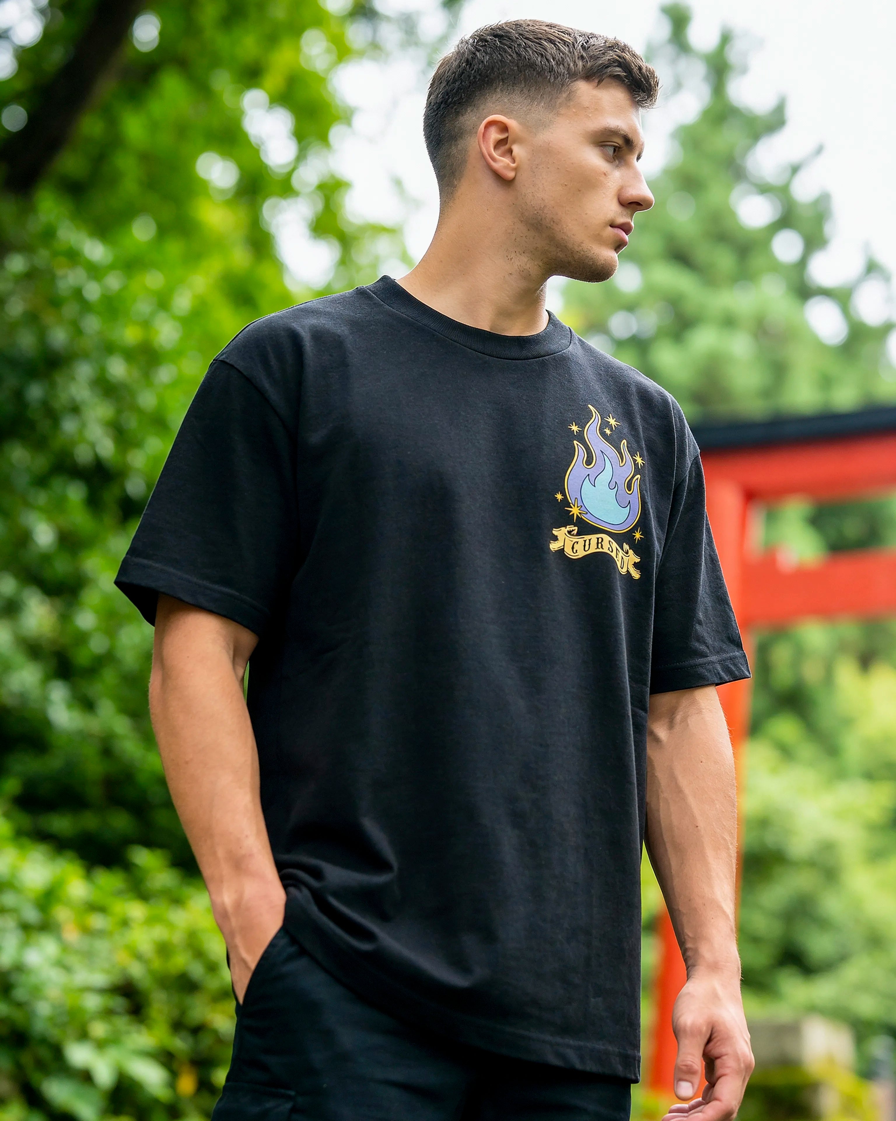 Yuji Itadori cargando energía, listo para el combate. La llama azul Cursed en el pecho como marca de iniciación al mundo de jujutsu.