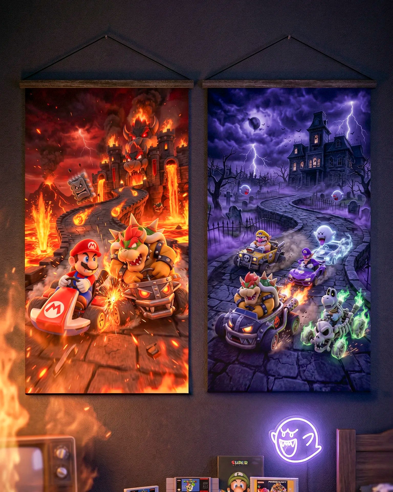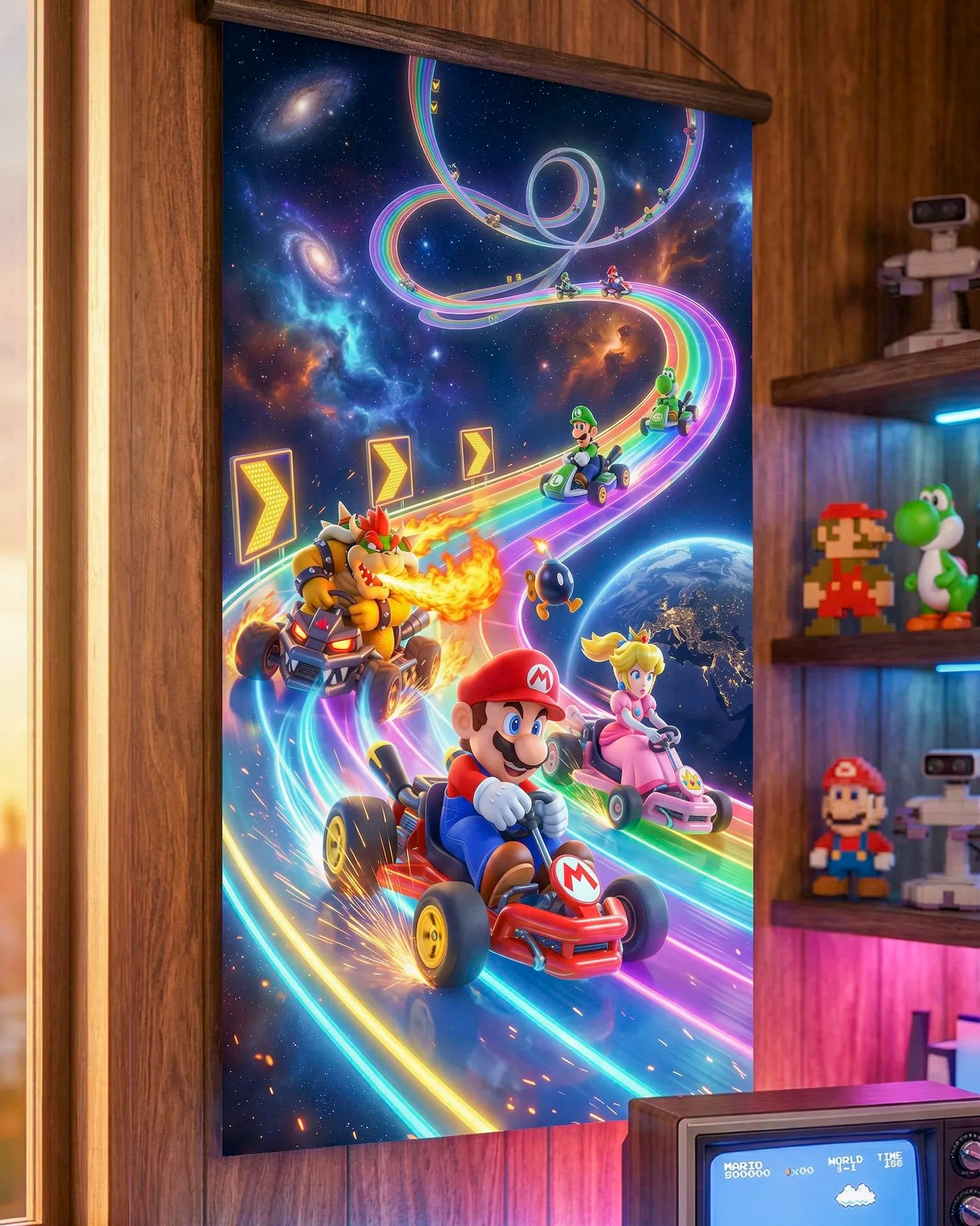 Pósters con circuitos de Mario Kart como nunca los habías visto, tu pared llena de toda la adrenalina de las carreras.